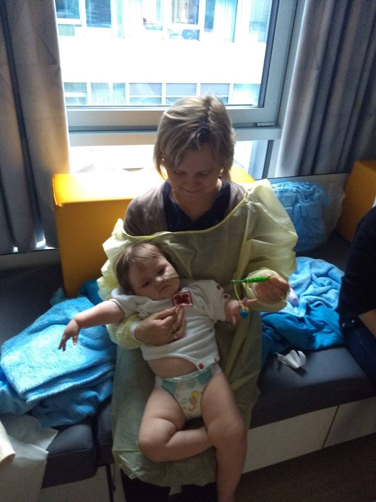 Terug op de kamer valt ze gelukkig relatief snel in slaap. Ik ben ondertussen ook vreselijk moe, maar er is geen tijd om een dutje te doen, over een paar minuten komen ze haar halen voor een echo van haar lever te nemen, want ze willen een soort van baseline hebben hoe haar lever eruit ziet voor het dieet. Ze zien soms namelijk dat er wel lever vervetting kan optreden. Hoewel het de kinderafdeling van de echografie is, is de dokter die de echo neemt niet echt kindvriendelijk. Hij zegt niets, hij lijkt er ook niet goed tegen te kunnen dat ze maar blijft huilen en op het einde zegt hij droog dat de resultaten in haar medisch dossier komen en dat die wel besproken met ons zullen worden. Ik weet dat het op zich zo een niets zeggend zinnetje is, maar ondertussen word ik toch weer ongerust, misschien zijn de resultaten toch niet zo goed en zegt hij daarom niets. Omdat Lara nu al zo ontroostbaar is, ze haar bedje ook bevuild heeft met waterige diarree wil ik haar niet terug in haar bedje leggen, maar zo mee nemen. Wanneer ik de dokter even om hulp wil vragen om dit allemaal gereed te krijgen is hij alweer verdwenen. Daar sta ik dan, Lara over de schouder, en met 1 handje moet ik het bedje dan maar proberen voort te duwen en te sturen. We zouden terug naar de wachtzaal moeten, maar eigenlijk heb ik niet goed opgelet toen we naar het echolokaal gingen, ik weet dus niet goed naar waar ik moet lopen. Gelukkig merkt de baliemedewerkster vanop een afstand dat het niet zo handig is en schiet ze me te hulp, oef!