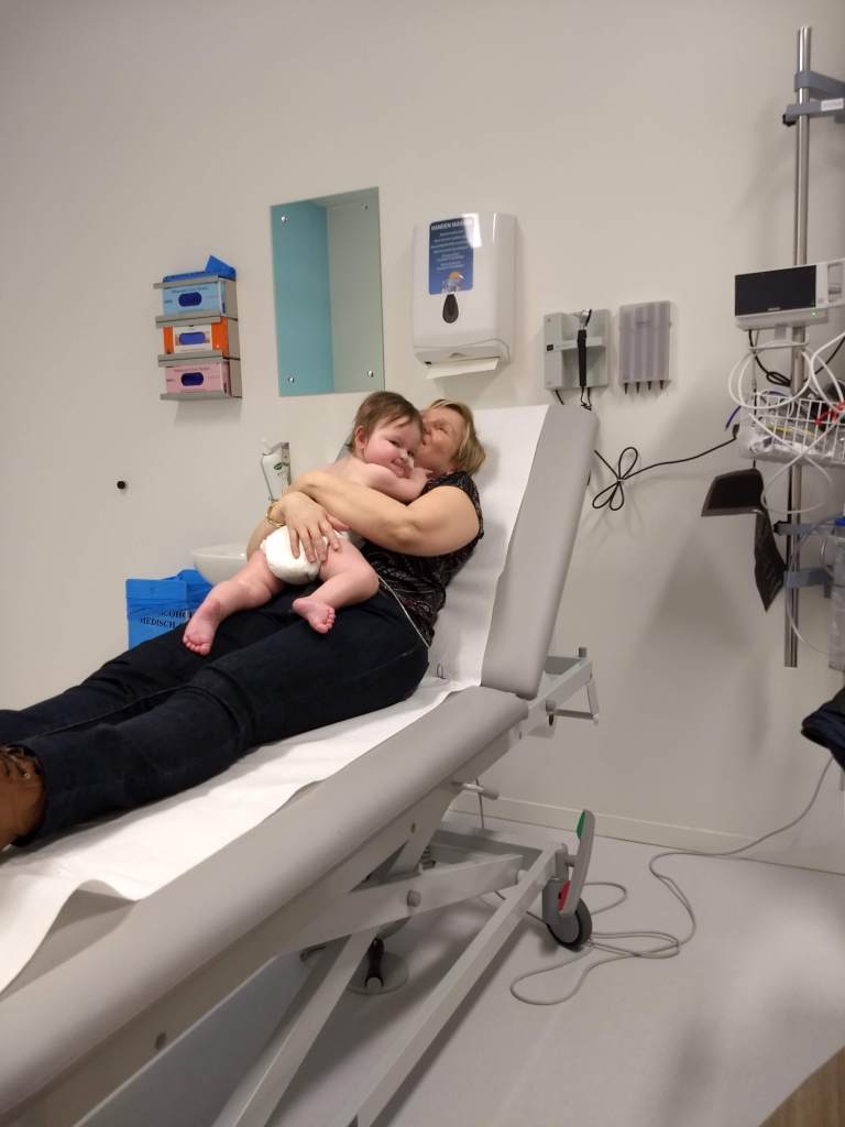 Wanneer ze dan bloed moeten prikken hebben ze zelfs niet eens de prikbon voorhanden, die moeten ze nog gaan halen… Het werkt mij allemaal serieus op mijn systeem. Wanneer alle onderzoeken gedaan zijn, sturen ze ons naar een kamertje waar we haar rustig op ons gemak kunnen aandoen, maar het is ondertussen alweer 4u geleden dat Lara gegeten heeft, dus moeten we ze weer aan de sonde hangen… Natuurlijk is niets hier ook voorzien om dergelijke dingen aan op te hangen en dus moet mijn schoonmoeder het ding zelf een kwartiertje in de lucht houden, voor de 2de keer al vandaag. Uiteraard hadden ze niet verwacht dat we dit kamertje zo lang zouden gebruiken en plots staan de volgende patiënten al binnen. Geschrokken, omdat het lokaal niet leeg was, liepen ze terug naar buiten. Gelukkig was de verpleegster die aan de andere kant binnenkwam begripvol en liet ons nog even doen en bracht de ouders met hun kindje op de hoogte dat het lokaaltje zo vrij zou komen maar dat ze eventjes moesten wachten. Lara was ondertussen doodop in mijn armen in slaap gevallen. Ik had echt zo met haar te doen ocharme…